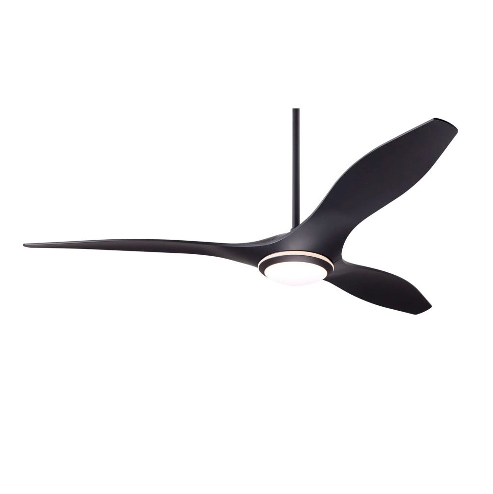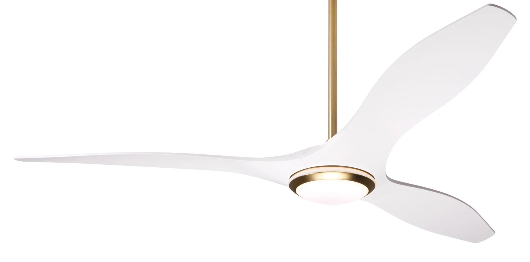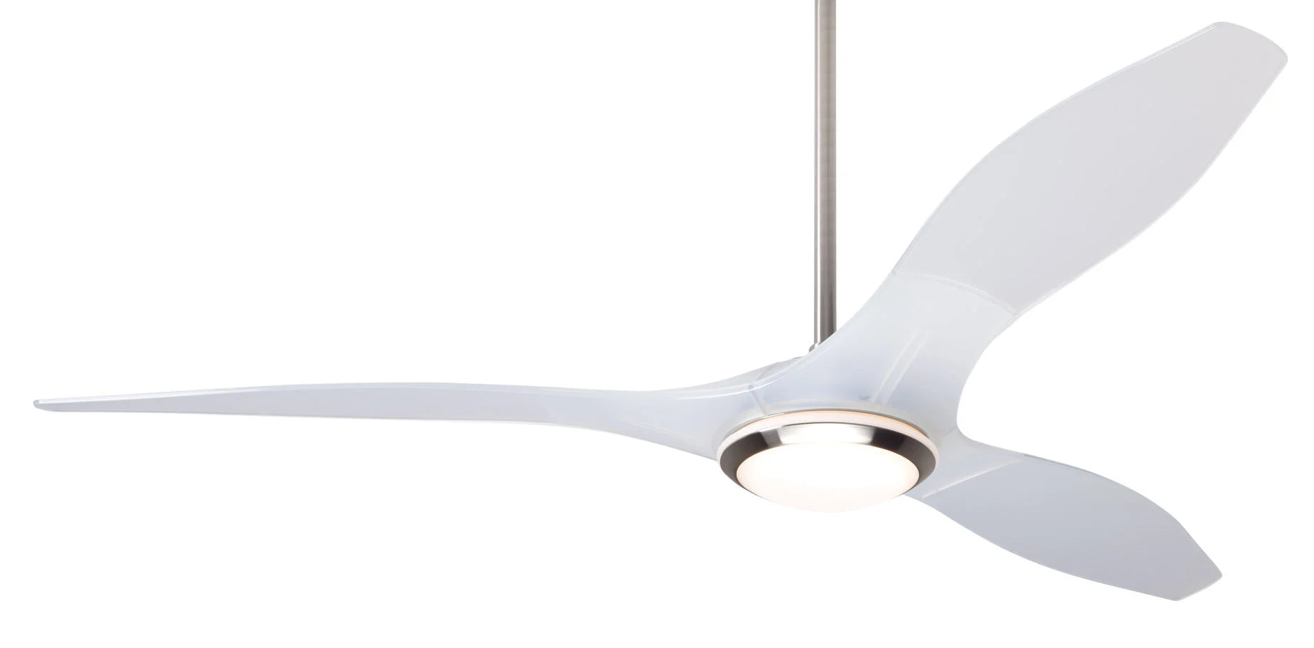 The IC/Brisa DC features a 6-speed reversible DC motor. The LED light included is a 17W, 90 CRI, 3000K, 1530 lumens (dimmable) behind an opal glass diffuser; CA Title 24 (JA8) compliant. With a die cast aluminum and injection-molded ABS construction, this modern and sleek beauty adds instant style to your room. The fan includes 6 and 18 inch downrods; these allow for the fan to hang 11.4 and 23.4 inches respectively. Slope compatible up to 20 degrees. Designed by Guto Indio de Costa. Suitable for dry and damp locations. The fan wights 12 lbs. Contact for longer downrod options or for a slope adapter up to 45 degrees. Includes a remote control. Wall control option available. Please inquire.
