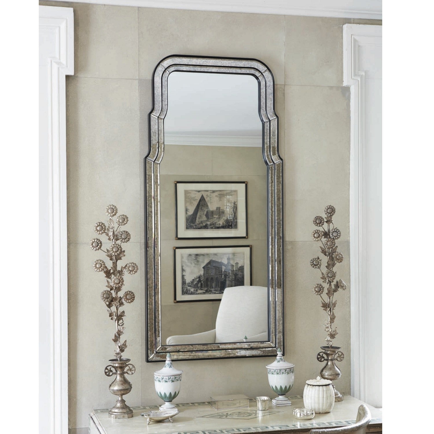 The Anne Venetian mirror is an antiqued mirror framed mirror with beveled frame. This fine mirror has graceful curves and will look amazing in a classicly styled home. At 50" in height, this mirror could serve as a focal point of a room or accent a large space. Designed by Bunny Williams. Size: 24" x 50".