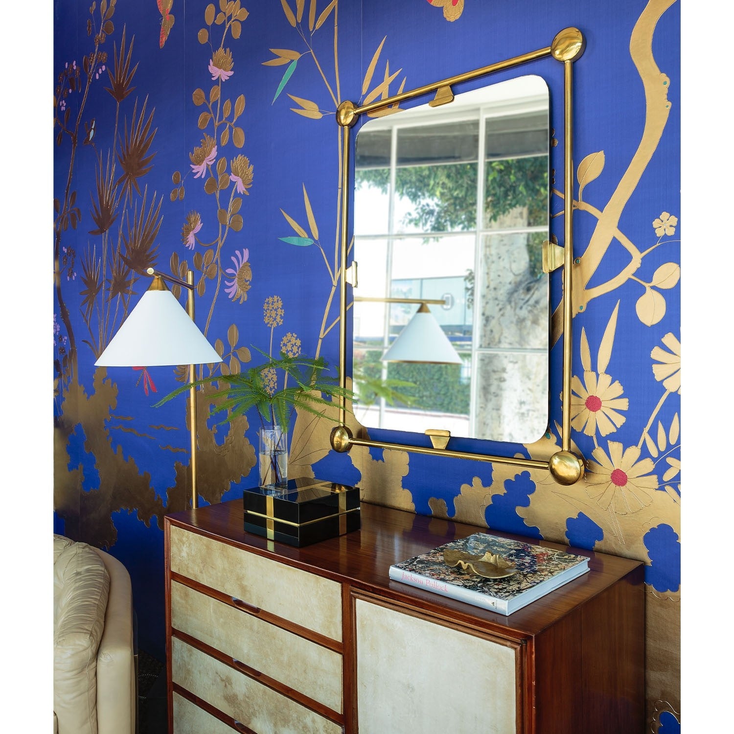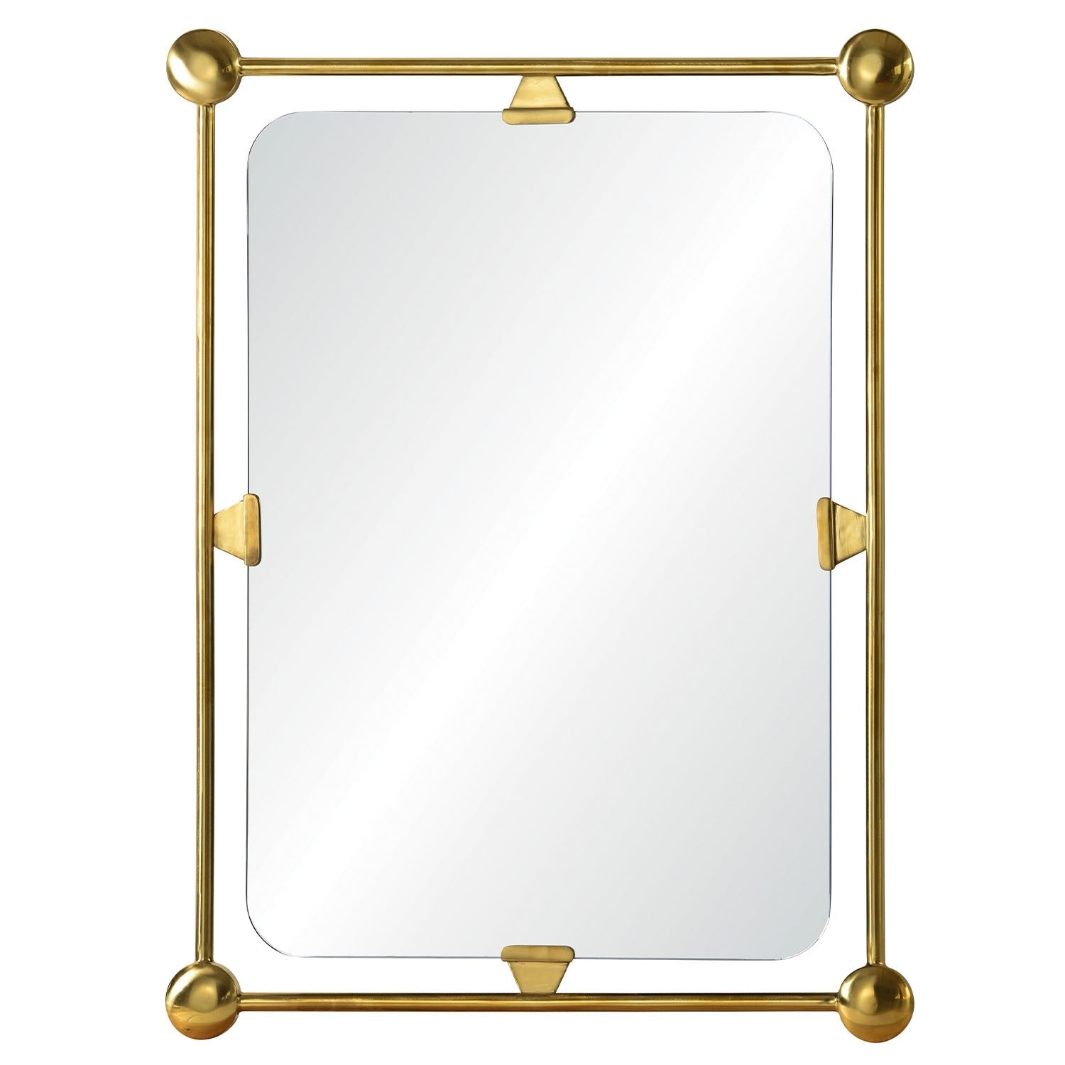 Featuring a polished stainless or burnished brass frame, this avant garde mirror is designed by renowned designer Celerie Kimble. A unique eye catching design, this mirror is perfect as a vanity, for your bedroom or living space. Created by Mirror Home, a leading resource or luxury mirrors for designers. Size is 30" x 40".