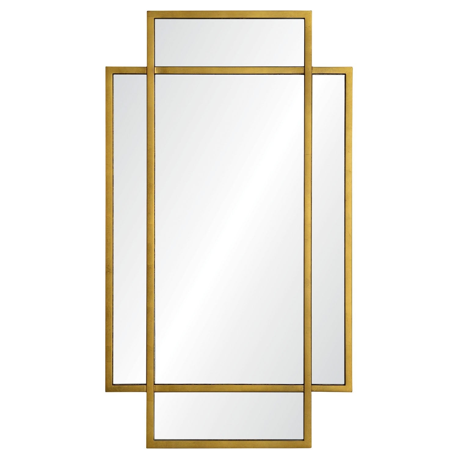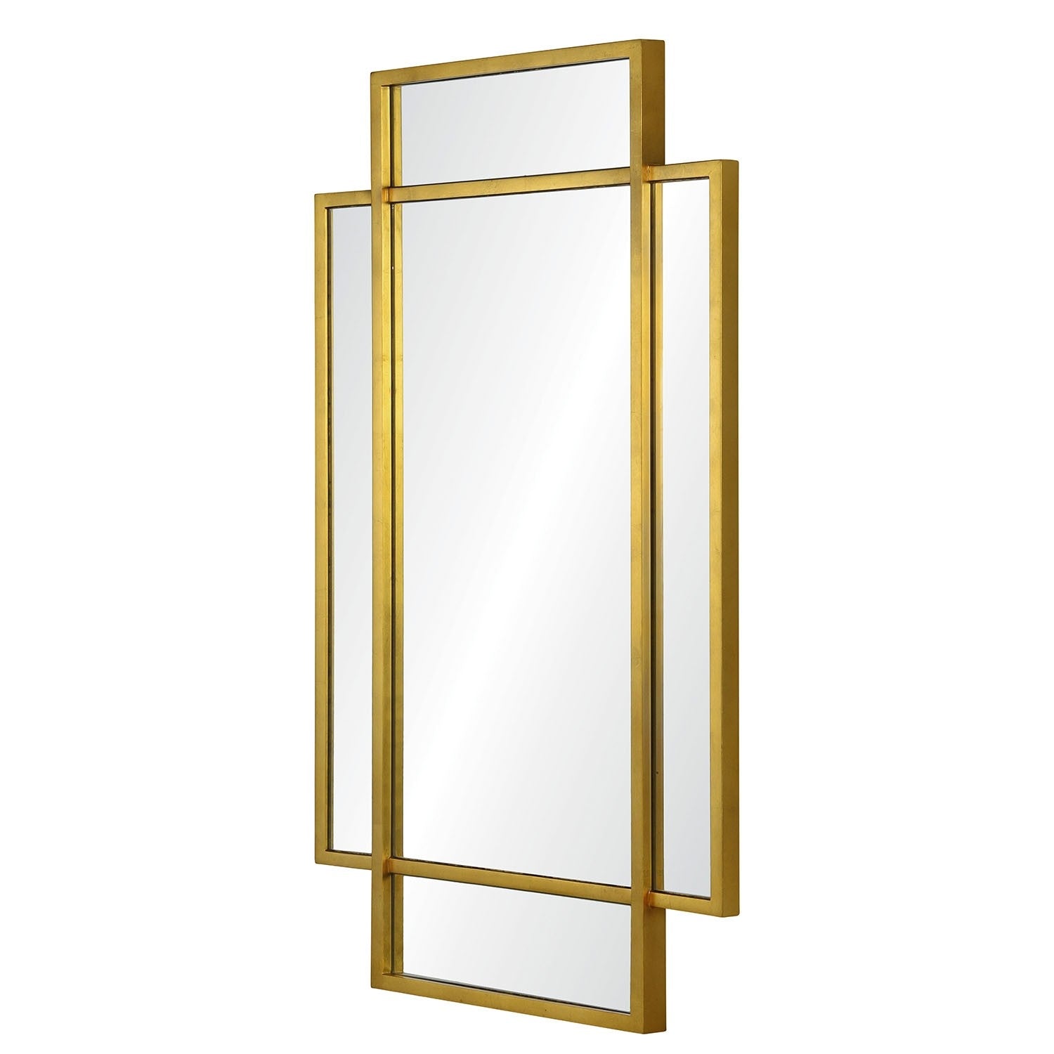 The Helen Mirror is modern yet classic. Designed by Jamie Drake. Hand carved wood frame mirror finished in cosmopolitan gold leaf or silver leaf. Non-beveled center mirror. Cleat hardware provided.