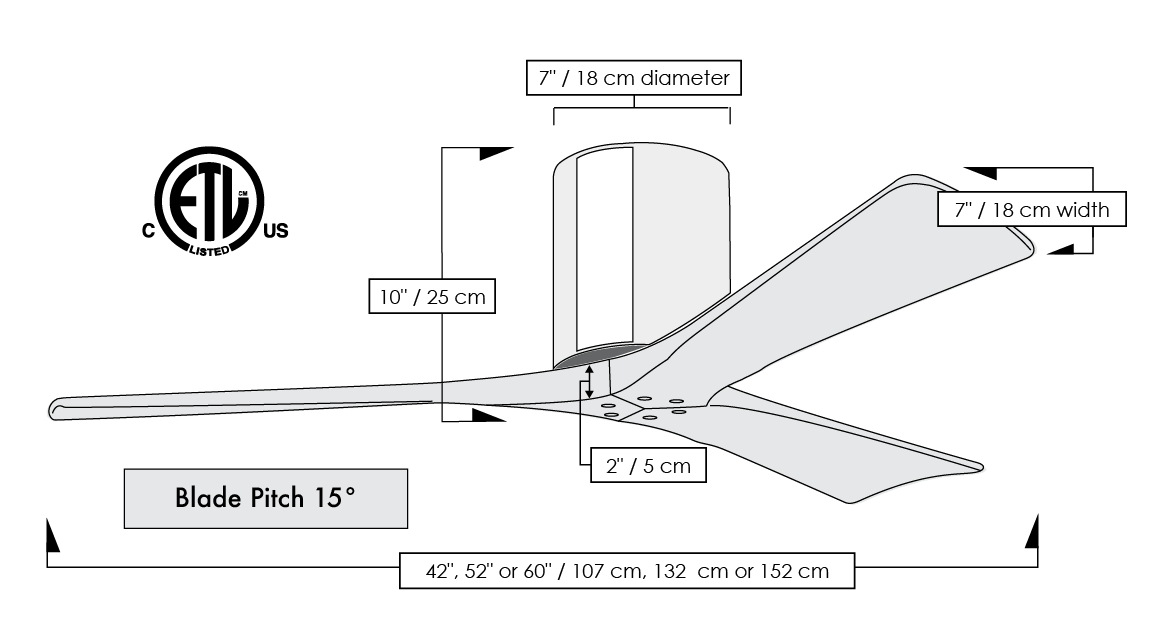 The Irene 3H hugger style ceiling fan by Matthews Fan Company is a unique blend of contemporary and rustic. The rodless ceiling fan features a cylinder motor housing and five neatly joined solid walnut-stained wood blades. An ultra quiet, six speed motor let's you stay cool in style. Created from cast aluminum and heavy stamped steel. This fan includes a wall mountable handheld remote with reverse on the remote. Available in black, white, brushed nickel, chrome or textured bronze finishes, and with 42" or 52" or 60"blades. Housing is 7" in diameter.
