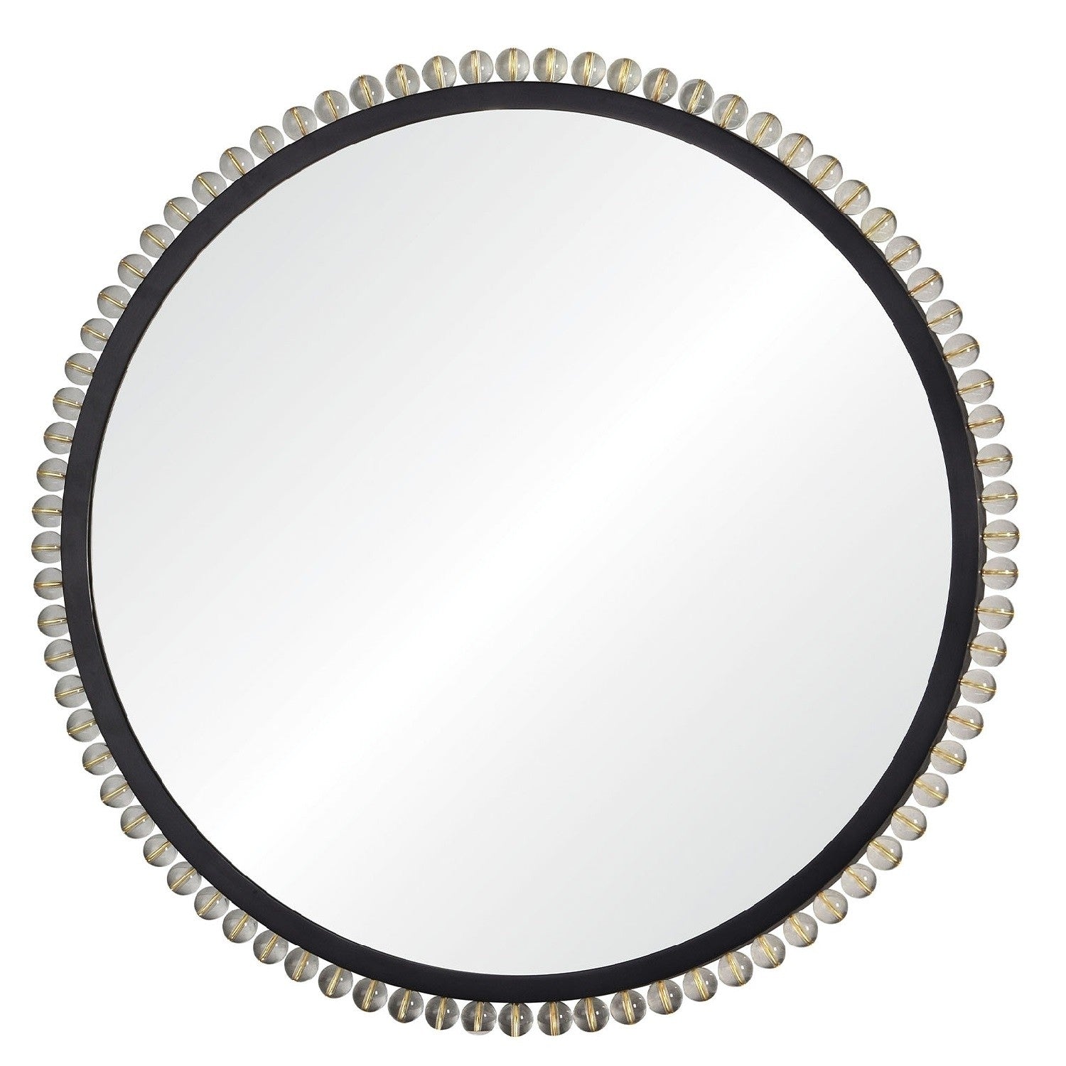 The Mazi round mirror has a very unique design Hand welded stainless steel frame finished in black nickel and surrounded by acrylic spheres attached by brass hardware. Non-beveled center mirror. Cleat hardware provided.