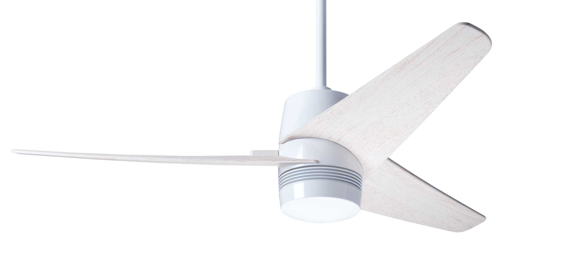 The Velo has an ultra-cool barrel shaped fan housing with vented ring detailing that provides a very hip look. Three molded plastic blades round out the functional style of this contemporary ceiling fan. The fan has a high efficiency DC motor. It comes with a remote control. Wall control available.